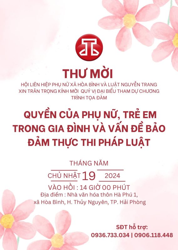 Tiếp nối dư âm Ngày của Mẹ 12/5 và hướng đến Quốc tế Thiếu nhi 01/6 sắp tới, thực hiện vai trò trách nhiệm với cộng đồng theo đúng chủ trương, chính sách của Nhà nước về công tác tuyên truyền phổ biến chính sách pháp luật, ngày 19/05/2024 Luật Nguyễn Trang phối hợp cùng Hội liên hiệp Phụ nữ xã Hoà Bình, H. Thuỷ Nguyên, TP. Hải Phòng tổ chức chương trình toạ đàm chia sẻ về chủ đề “Quyền của phụ nữ, trẻ em trong gia đình và vấn đề bảo đảm thực thi pháp luật” vào hồi 14h00 tại Nhà văn hoá thôn Hà Phú 1, xã Hoà Bình, H. Thuỷ Nguyên, TP. Hải Phòng. Xin trân trọng kính mời Quý vị quan tâm tham dự chương trình toạ đàm để cùng cập nhật kiến thức pháp luật bổ ích từ Luật Nguyễn Trang